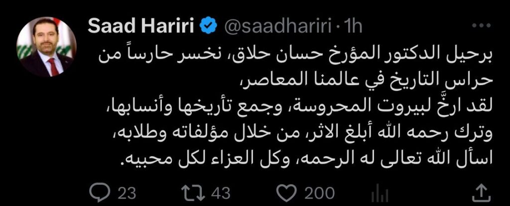 الحريري عن رحيل حسان حلاق: خسرنا حارساً من حراس التاريخ